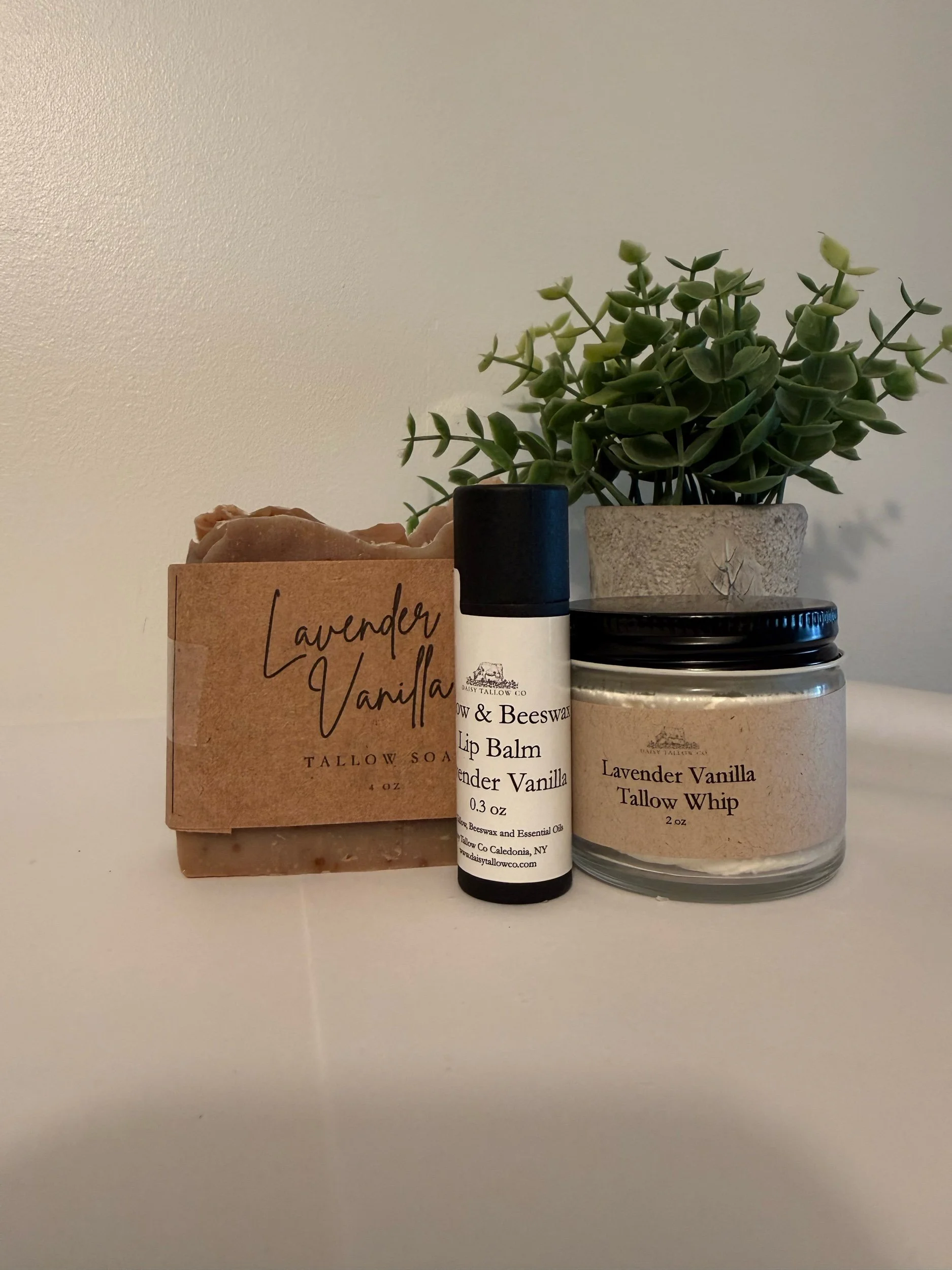 Lip Balm: Made with two simple ingredients. This lip balm is a handbag or pocket favorite. Tallow, beeswax and essential oils (if scented) making this lip balm the perfect solution to hydrate your lips whether they are chapped or just in need of some hydration. If you are not feeling Original grab a Lavender or Peppermint scent!